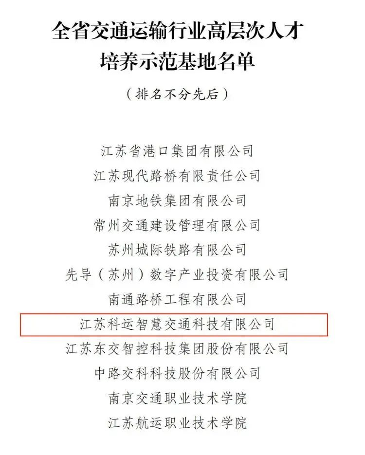 ? ? ??近日,在各單位自主申報、各設(shè)區(qū)市交通運輸局和有關(guān)單位初審?fù)扑]的基礎(chǔ)上,經(jīng)省廳組織復(fù)審,評選出12家單位為“全省交通運輸行業(yè)高層次人才培養(yǎng)示范基地”。其中,集團(tuán)旗下江蘇科運智慧交通科技有限公司(以下簡稱“江蘇科運智慧”)成功入選。